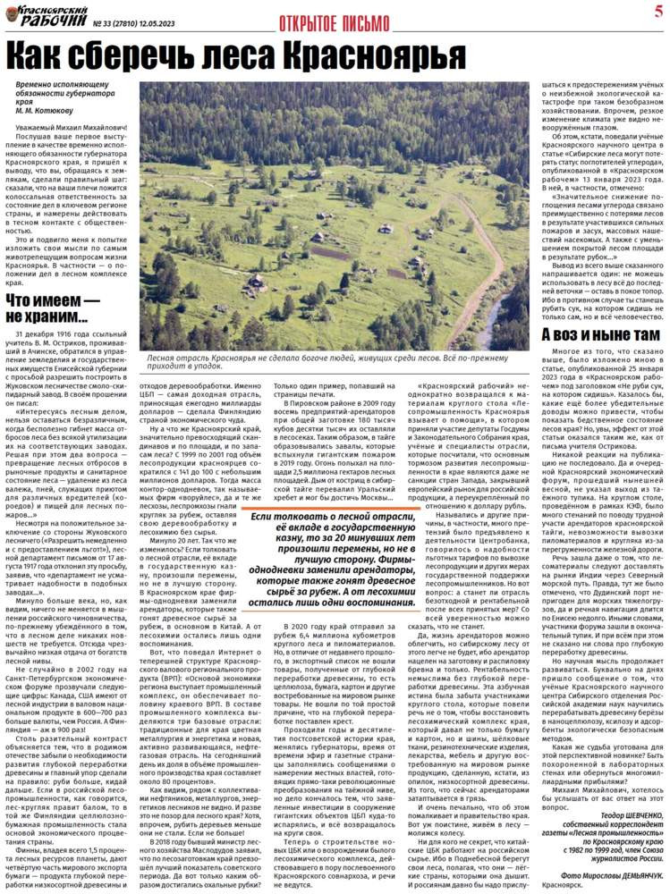 Под таким заголовком в номере "Красноярского рабочего" за 12 мая было опубликовано открытое письмо журналиста-ветерана Т. Ф. Шевченко, адресованное временно исполняющему обязанности губернатора края М. М. Котюкову и посвящённое проблемам лесопромышленного комплекса.