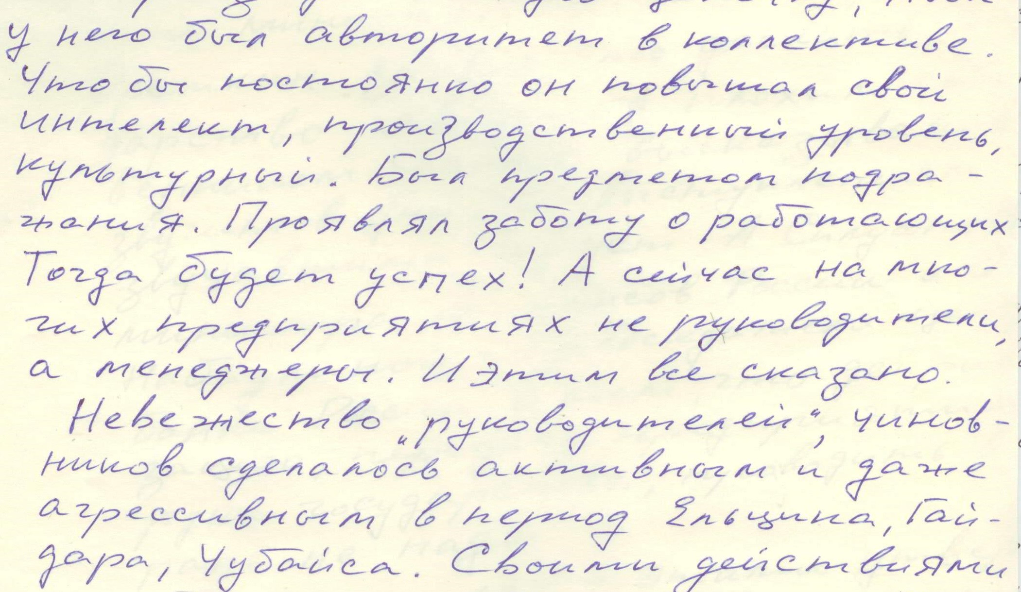 Во многом успех любого предприятия, любого коллектива зависит от руководителя. Хороший руководитель - это "штучный продукт". Его надо растить и готовить. Желательно, чтобы он прошёл путь рабочего, мастера, начальника участка, цеха - то есть всю производственную цепочку, чтобы у него был авторитет в коллективе. Чтобы он постоянно повышал свой интеллект, производственный уровень, культурный. Был предметом подражания! Проявлял заботу о работающих. Тогда будет и успех! А сейчас на многих предприятиях не руководители, а менеджеры. И этим всё сказано.