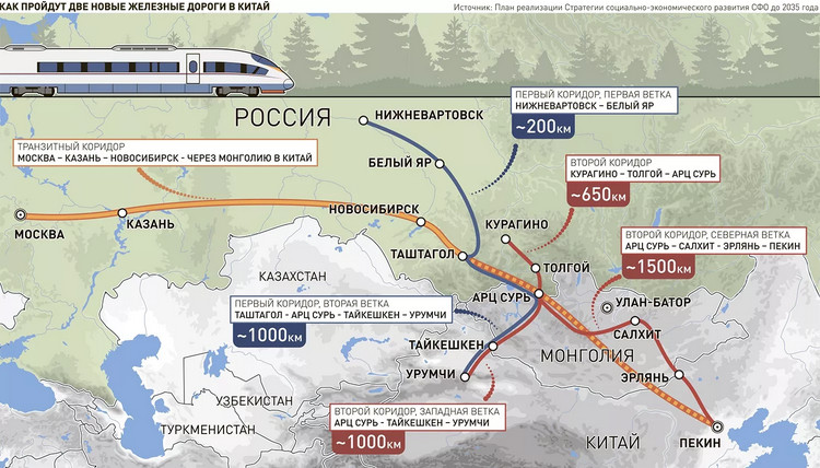 Предполагается строить два коридора. Первый - Северо-Сибирская магистраль - будет иметь две ветки - от Нижневартовска до Белого Яра в Томской области и от Таштагола в Кемеровской области до Урумчи в Китае.