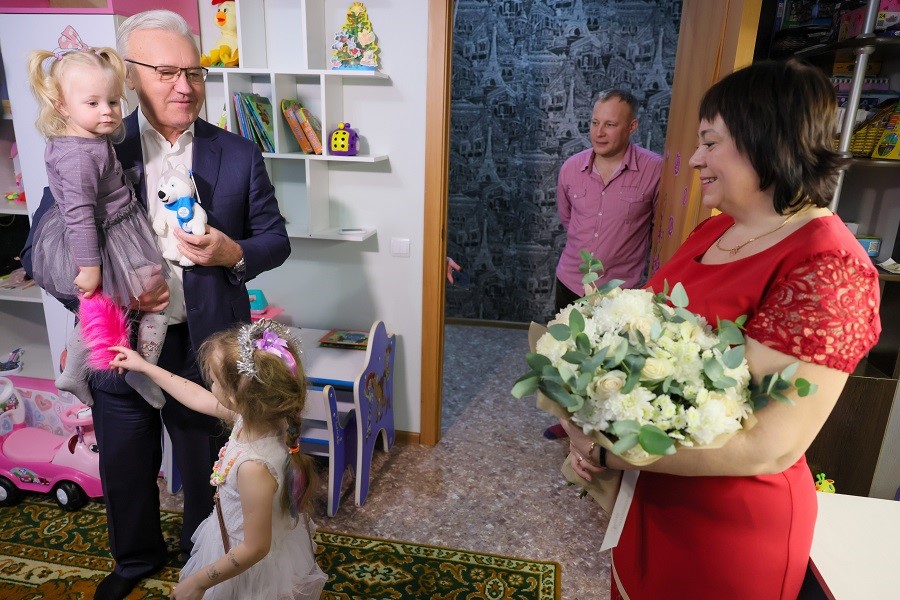 «Очень рад видеть вас в таком составе в новой просторной квартире, у вас очень уютно и комфортно. Теперь в вашем микрорайоне есть новый детский сад и самая большая школа за Уралом – уверен, девочкам там понравится», – отметил Александр Усс. «Надеюсь, вы будете хорошо учиться, и радовать маму и папу», – пожелал он сестрёнкам.