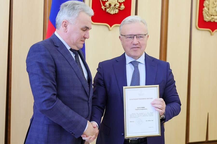 КРАСНОЯРСКИЙ КРАЙ, /НИА-КРАСНОЯРСК/. Губернатор Красноярского края Александр Усс вручил вице-премьеру края Сергею Козупице Благодарственное письмо Министерства строительства и ЖКХ РФ за вклад региона в реализации специального инфраструктурного проекта по развитию новых территорий России.