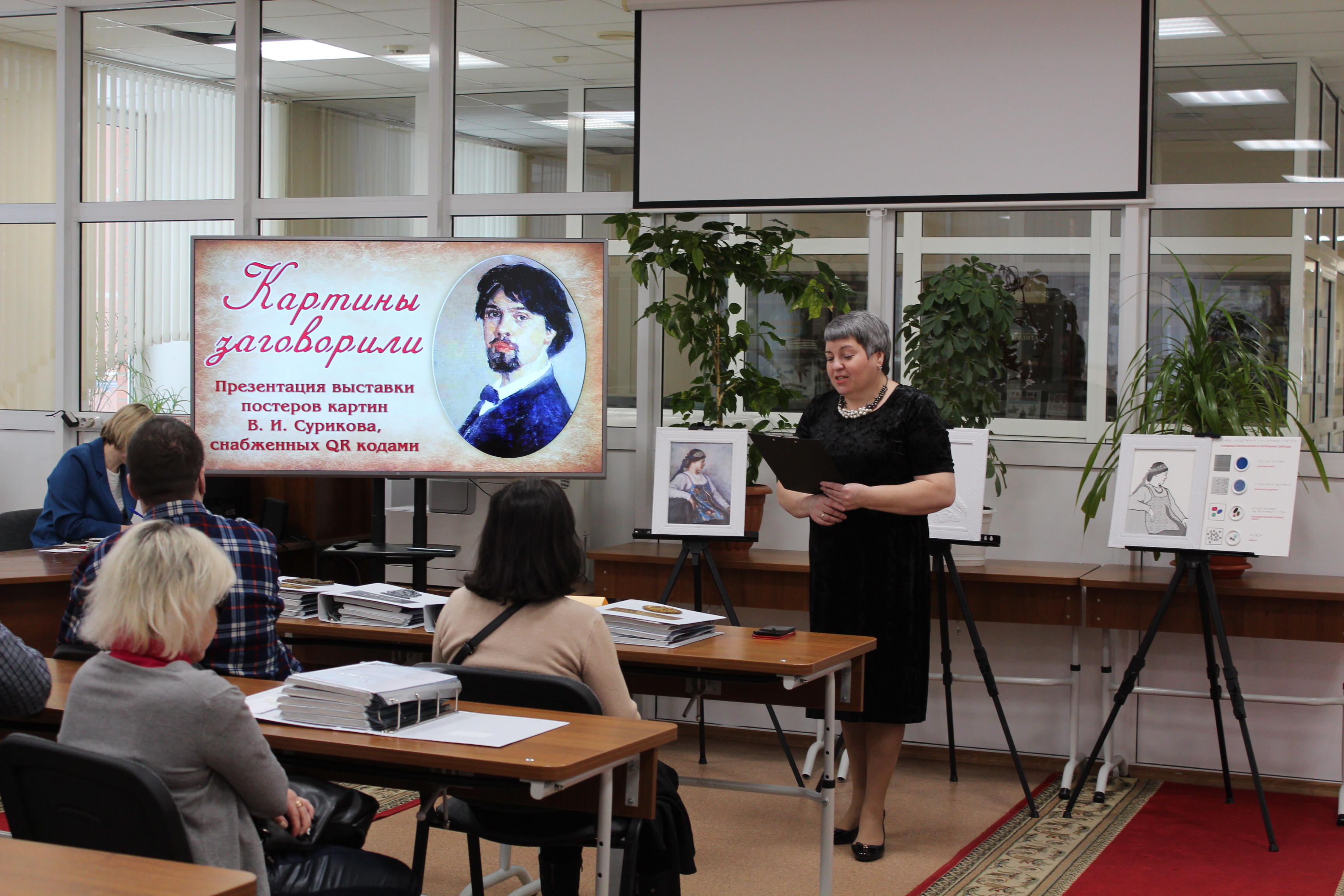 По окончании презентации желающие ознакомились с выставкой репродукций наиболее известных картин художника "Уникальный живописец В. И. Суриков", оформленной в библиотеке. Экспозиция представлена 16 печатными копиями известных полотен художника, в числе которых -- "Вид памятника Петру I на Сенатской площади в Петербурге", "Меншиков в Берёзове", "Взятие снежного городка".