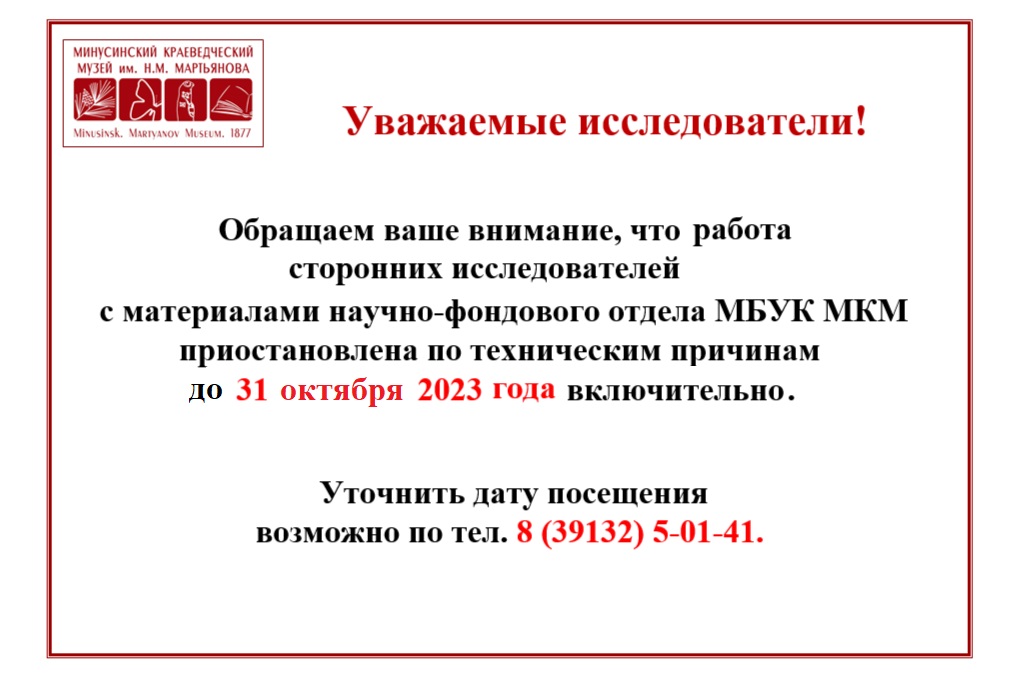 В настоящее время по техническим причинам приостановлена работа сторонних исследователей с материалами научной библиотеки и научно-фондового отдела МБУК «Минусинский региональный краеведческий музей им.