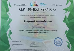 Под руководством педагога дополнительного образования (куратора) Писаревского Владимира Петровича, наши юные конструкторы из кружка «Робототехника» в январе 2023 года приняли участие во II Всероссийском детском конкурсе конструирования «Веселые Lego-изобретения». В номинации «Lego-робототехника» ребята (а это была команда из одних девочек) заняли достойное 2 место с вручением дипломов.