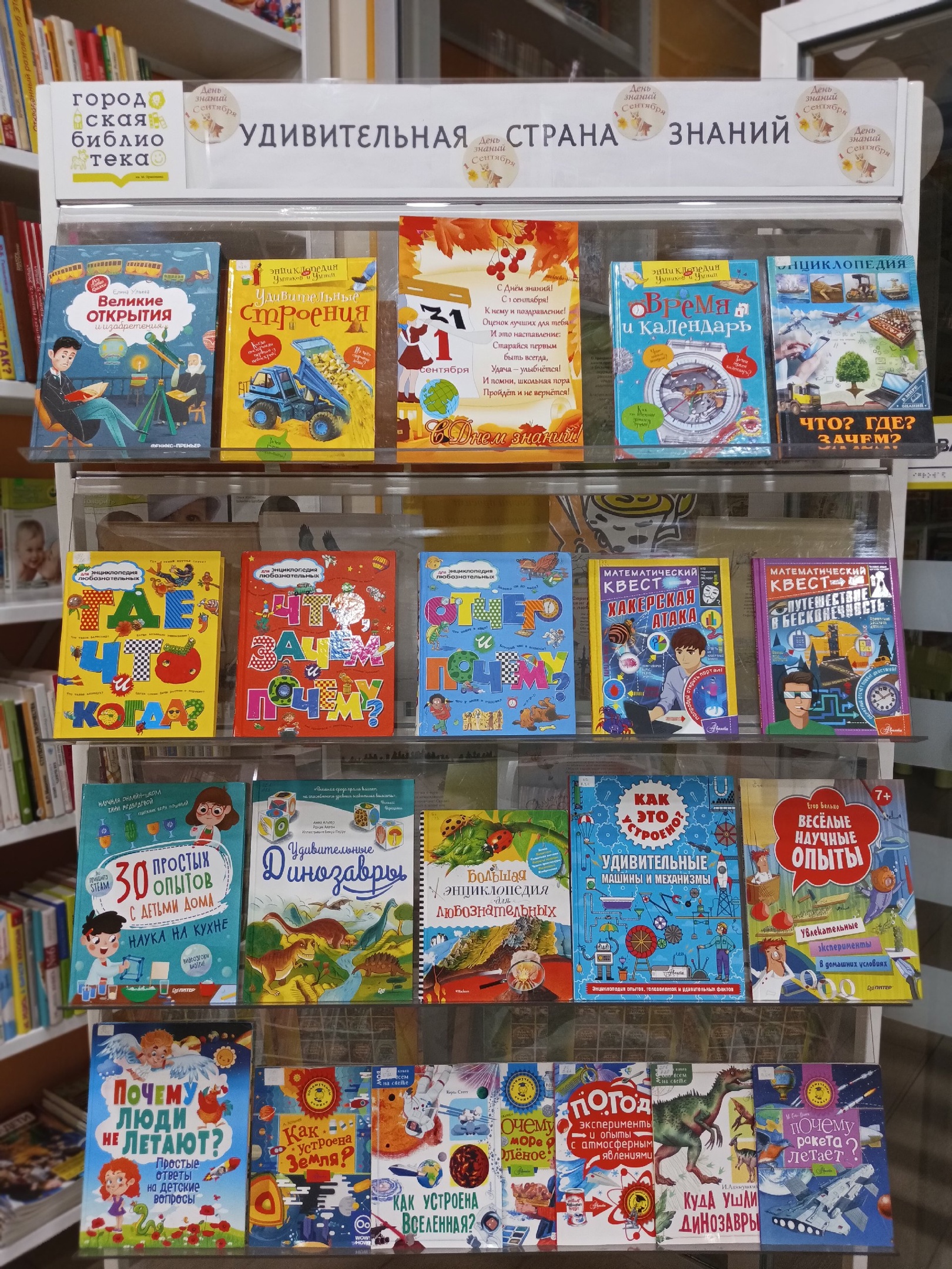 В "Страну знаний" приглашает младших школьников выставка научно популярных книг.Всем юным читателям понравится повторение пройденного, открытие нового неизвестного.