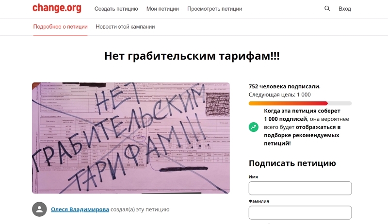 Авторы документа потребовали проверить необходимость повышения платы за ЖКУ и произвести точный перерасчет для горожан. На момент написания новости петицию поддержали более 750 человек.