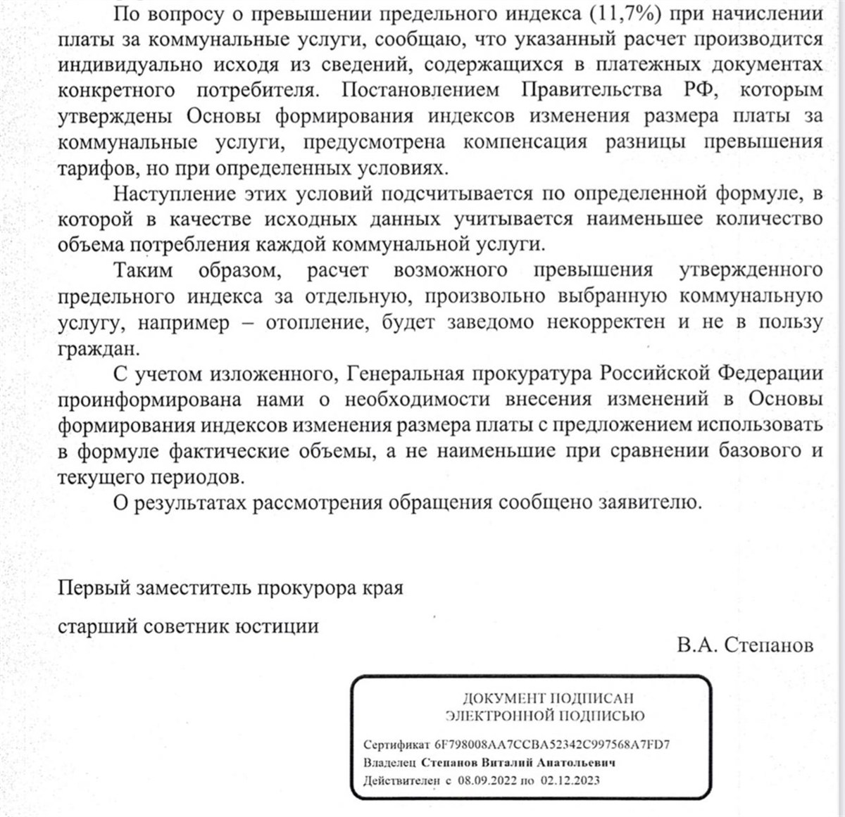 «Там установили главное — платеж выше установленного порога стал возможен из-за несовершенства федерального нормативного акта — „Основ формирования индексов изменения размера платы“. В существующей редакции он заведомо не в пользу жителей. Прокуратура края уже проинформировала Генеральную прокуратуру России о необходимости внесения изменений в этот документ в интересах жителей, в том числе Красноярска. Это, конечно, не вернет уже уплаченные деньги, но может предотвратить несправедливые платежи в будущем».