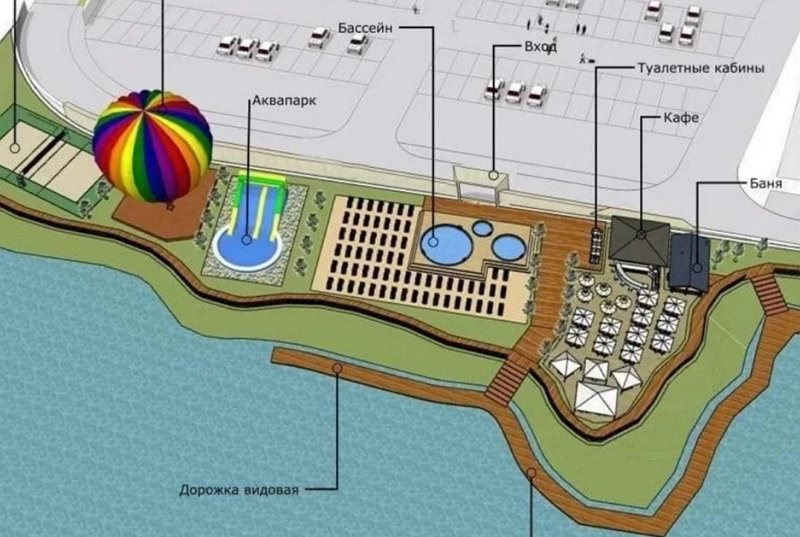 По данным агентства, на арендованной земле у торгового центра хотят открыть круглогодичное кафе, построить баню и установить беседки для отдыхающих. Летом на на участке будет работать общественный пляж и детский аквапарк, а зимой красноярцы смогут посетить здесь каток и покататься со снежных горок.