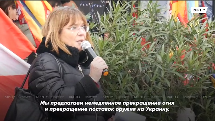«Мы против военной эскалации, проводимой западными странами, которые втягивают нас в третью мировую войну. Мы считаем, что войну нужно остановить, а не выиграть», — заявила на митинге член партии «Власть народу» Марта Колло.