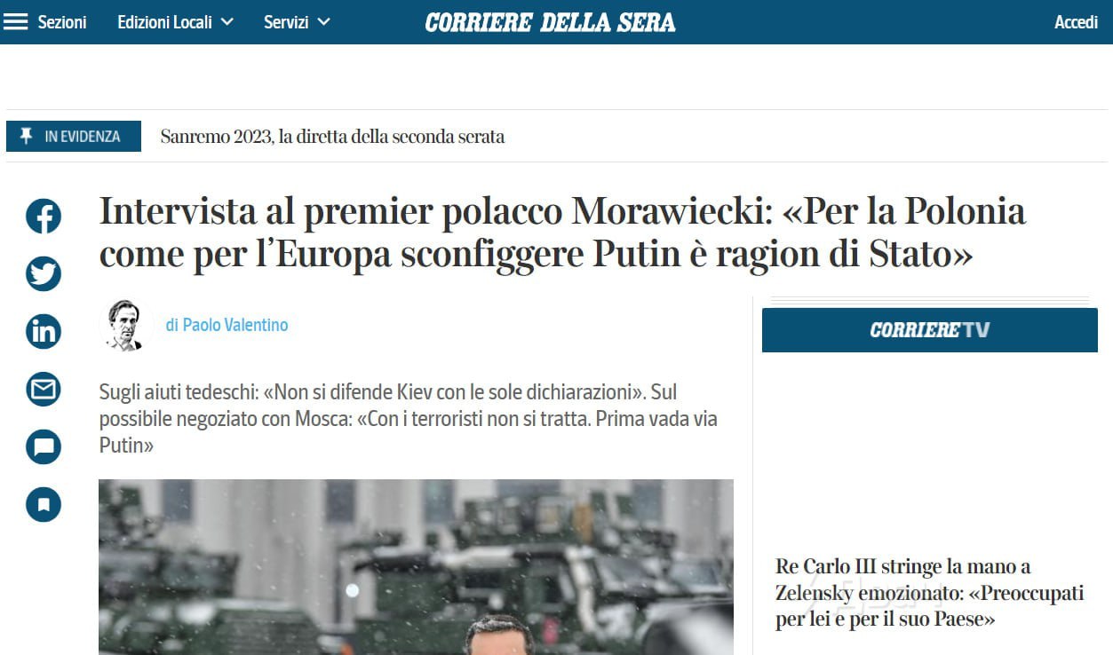 Победа над Россией — это и польский, и европейский государственный смысл», заявил премьер Польши Матеуш Моравецкий в интервью итальянской газете Corriere della Sera.