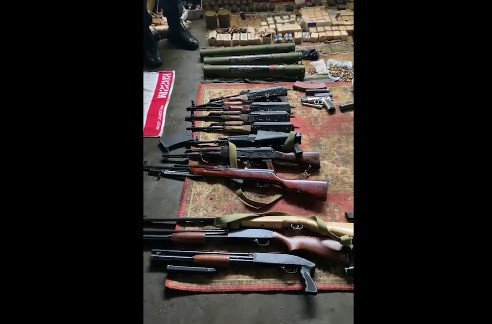 На кадрах оперативного видео показано задержание нелегальных любителей оружия, а также изъятый внушительный арсенал, в том числе пулеметы и гранатометы.