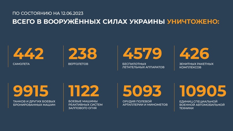 Всего с начала проведения специальной военной операции уничтожено: 442 самолёта, 238 вертолётов, 4 579 беспилотных летательных аппаратов, 426 зенитных ракетных комплексов, 9 915 танков и других боевых бронированных машин, 1 122 боевые машины реактивных систем залпового огня, 5 093 орудия полевой артиллерии и миномётов, а также 10 905 единиц специальной военной автомобильной техники.