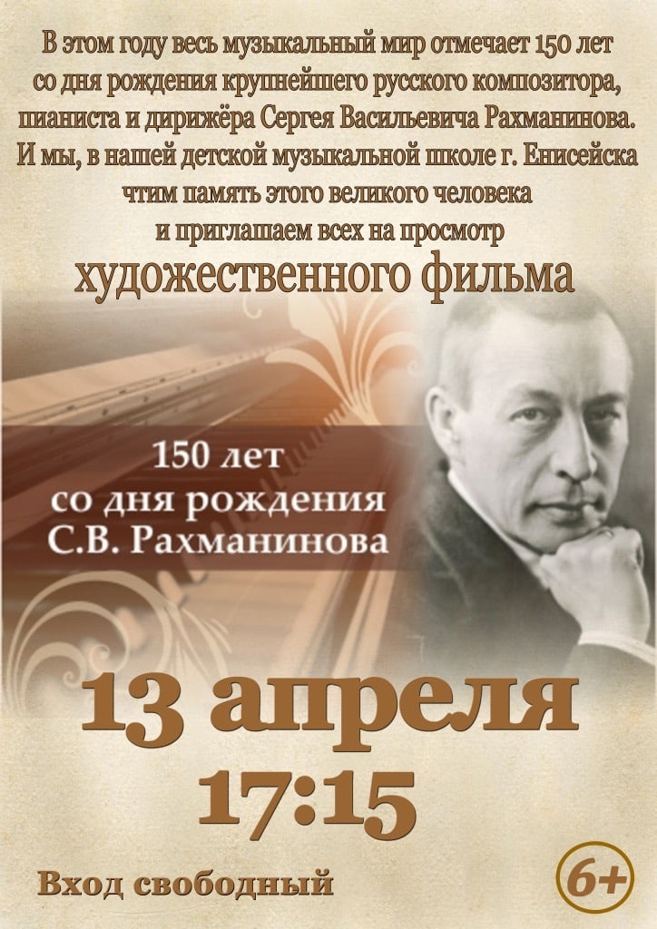 Детская музыкальная школа г. Енисейска приглашает жителей и гостей города на фильм к 150-летию со дня рождения крупнейшего русского композитора, пианиста и дирижёра Сергея Васильевича Рахманинова.