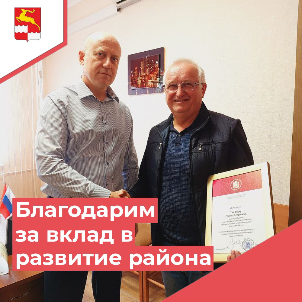 Председатель Кежемского районного Совета депутатов Шнайдер Александр Ранколович вручил Благодарственное письмо Законодательного Собрания Красноярского края директору ООО «Импульс», председателю Союза лесопромышленников Кежемского района Тимощуку Сергею Петровичу.