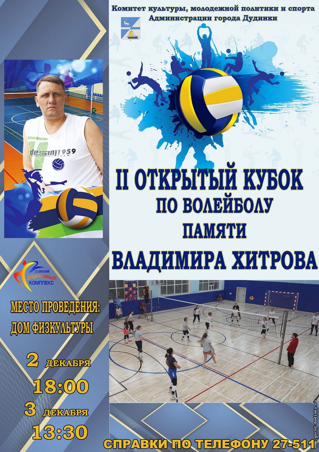2 декабря в 18:00 в Доме физкультуры МАУ «Дудинский спортивный комплекс» состоится торжественное открытие II Открытого кубка по волейболу памяти Владимира Хитрова.
