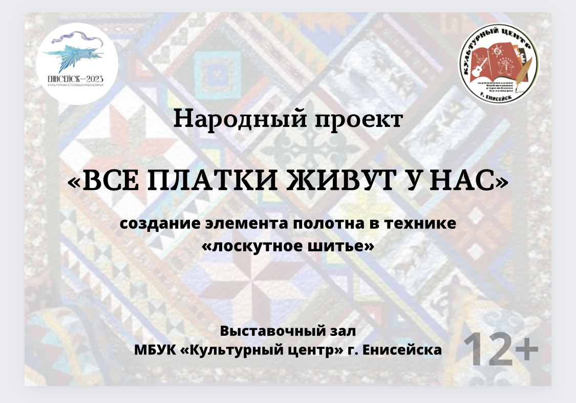 Все желающие могут поучаствовать в проекте, посетив мастер-класс по созданию элемента покрывала в технике «лоскутное шитье». Тематика проекта выбрана не случайно, так как культурная столица названа «Покрова Енисейска».