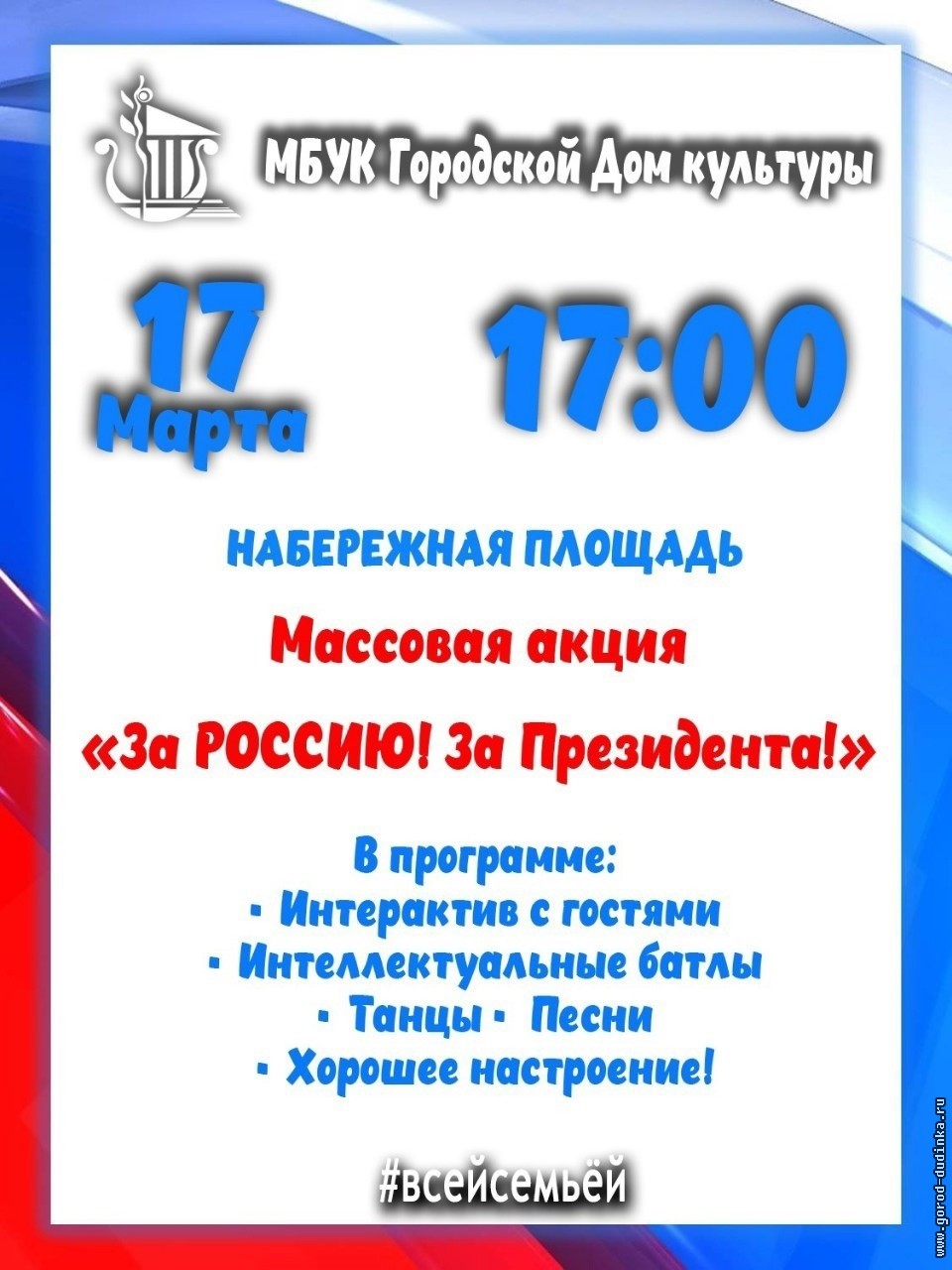 В финальный день голосования, 17 марта, в честь завершения масленичной недели всех пришедших на выборы будут угощать горячими блинами и чаем. Также в этот день на Набережной площади пройдет массовая акция «За Россию! За Президента!», где дудинцев ждут интерактивные игры, интеллектуальные викторины, танцы и песни. Мероприятие начнется в 17:00.