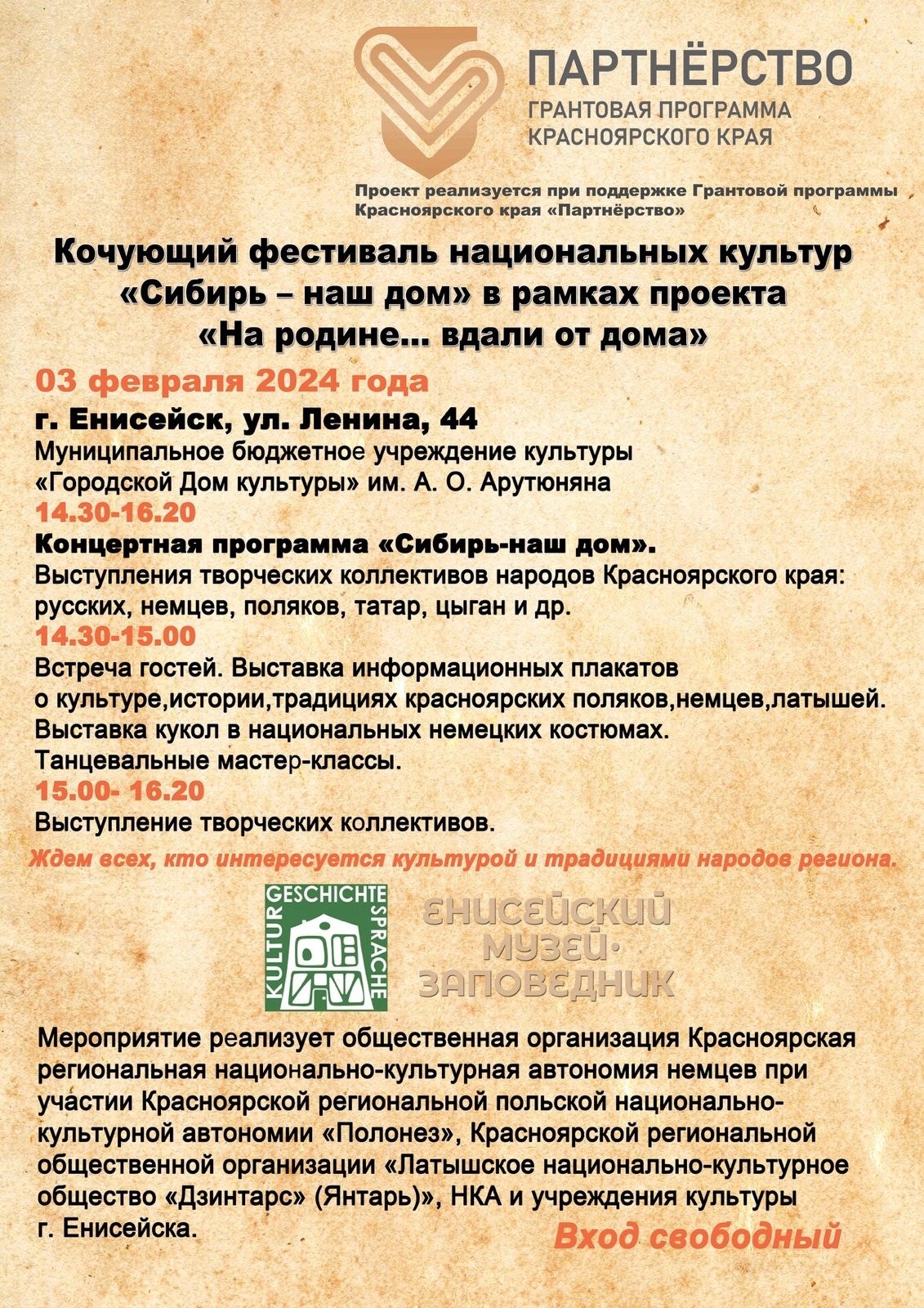 Мероприятие реализует общественная организация Красноярская региональная национально-культурная автономия немцев при участии Красноярской региональной польской национально-культурной автономии "Полонез", Красноярской региональной общественной организации "Латышское национально-культурное общество "Дзинтарс" (Янтарь), НКА и учреждения культуры г. Енисейска