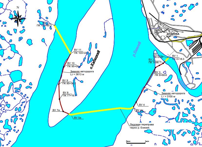 Ледовая переправа проходит по следующему маршруту: нулевой причал реки Дудинка – правый берег реки Енисей (район «Гидропорт») – река Енисей - остров Кабацкий – протока Кабацкая – левый берег протоки Кабацкая. Режим работы с 08.00 до 23.00.