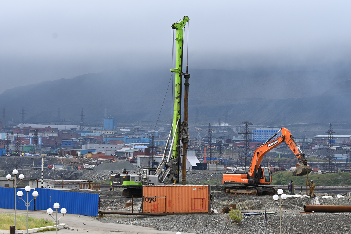На площадку завезен весь материал, установлены сваи, смонтирован металлический каркас. А вот изготовление 30-метровой стелы и ее доставка в Норильск опаздывают. Придется везти сооружение зимой морским путем.