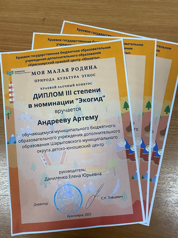 В Красноярском краевом центре «Юннаты» с 15 по 26 декабря проходил краевой заочный конкурс «Моя малая Родина: природа, культура, этнос», в котором приняли участие 30 обучающихся из 11 территорий Красноярского края. В их числе и наш Шарыповский муниципальный округ.
