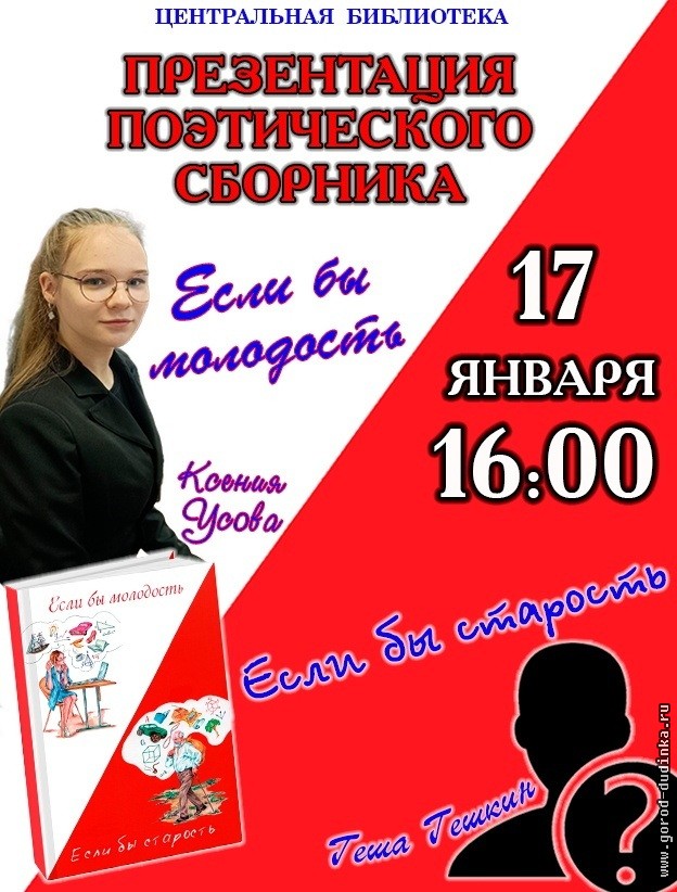 17 января в 16:00 в Центральной библиотеке пройдет презентация поэтического сборника «Если бы молодость/Если бы старость». Книга является итогом сотворчества двух людей: молодой начинающей поэтессы, выпускницы 2024 года средней школы № 3 города Дудинки Ксении Усовой и опытного поэта Геши Гешкина, личность которого остается загадкой. В сборнике представлены стихотворения, отражающие взгляды на различные жизненные темы, присущие людям разных поколений.