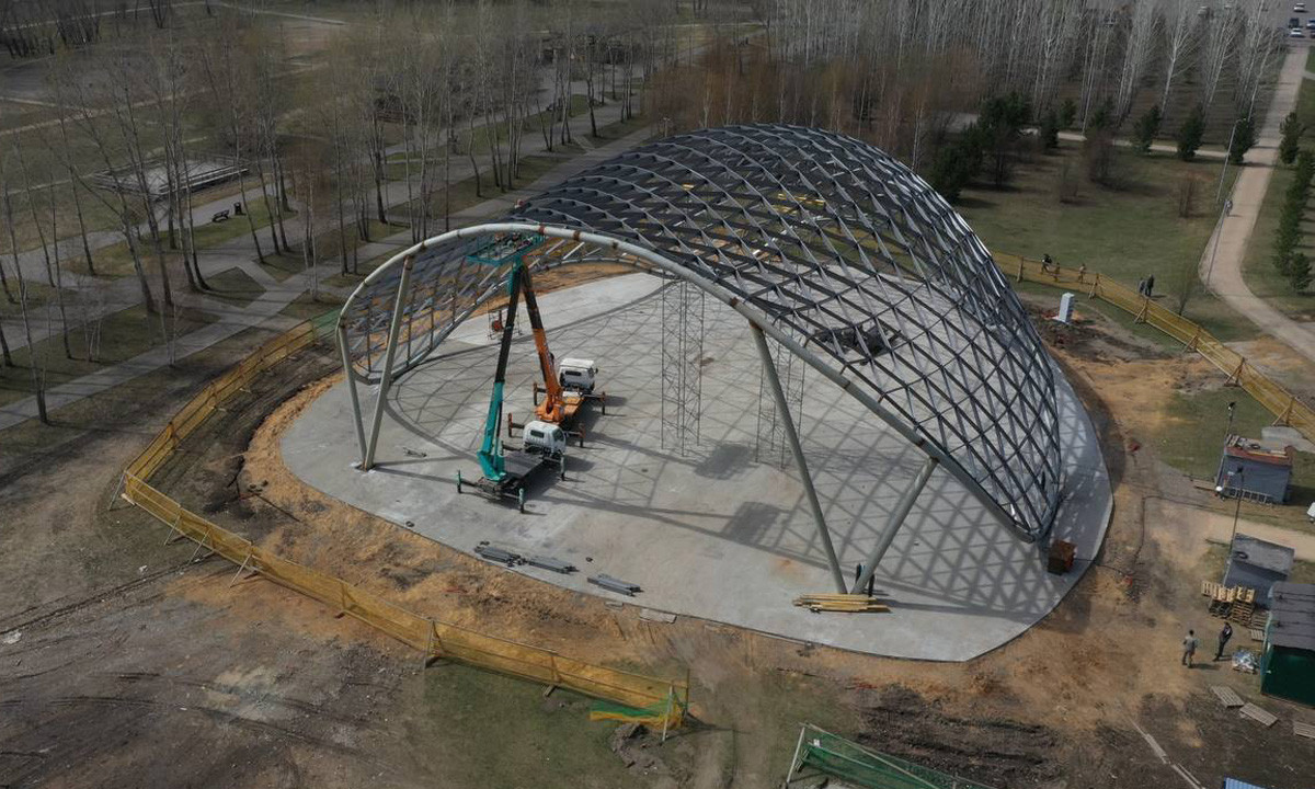 Продолжаются работы по возведению сценического комплекса в Татышев-парке. Монтаж каркаса купола уже почти завершён.
