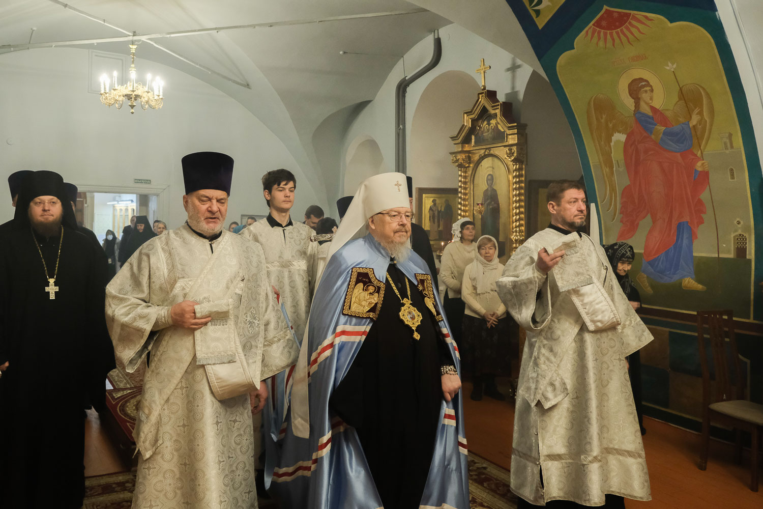 Его Высокопреосвященству сослужили: руководитель Административного секретариата Красноярской епархии, настоятель Покровского кафедрального собора города Красноярска митрофорный протоиерей Владимир Дорош; секретарь Красноярской епархии, благочинный церквей Левобережного городского округа Красноярска, наместник красноярского Успенского мужского монастыря игумен Иннокентий (Нилов); благочинный больничных храмов Красноярска, настоятель красноярских храмов апостола Андрея Первозванного и великомученика Димитрия Солунского иерей Виталий Вальтер; благочинный тюремных храмов Красноярской митрополии, штатный клирик Благовещенского собора иерей Родион Петриков; ключарь Покровского кафедрального собора города Красноярска иерей Игорь Лыткин.