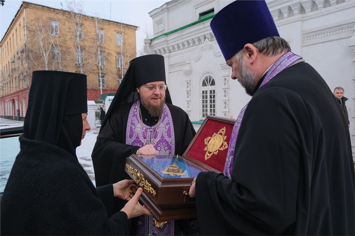 Встречу возглавил митрополит Красноярский и Ачинский Пантелеимон. Сопроводила святыню игумения монастыря святой Марии Магдалины села Никольское Марфа (Лоджанская).