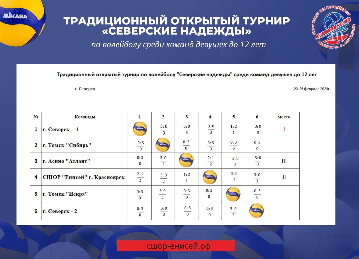 Результаты традиционного турнира «Северские надежды» по волейболу среди команд девушек до 12 лет, который проходил с 23 по 26 февраля в г. Северске.
