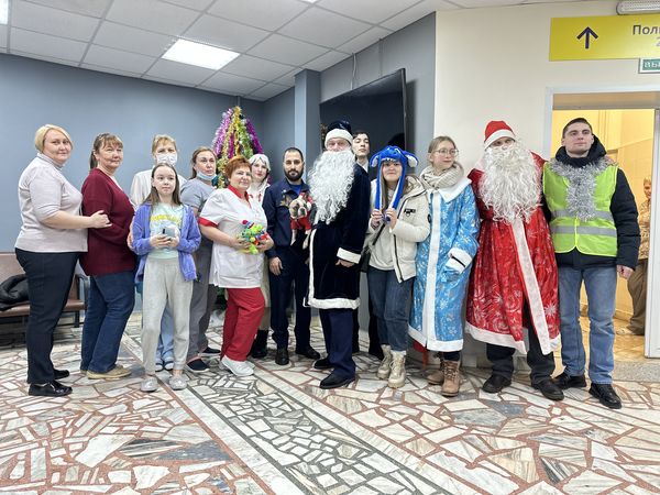 После оригинального приветствия все герои мероприятия отправились в холл больницы, чтобы передать медперсоналу подарки, которые затем распределят среди ребятишек каждого отделения.