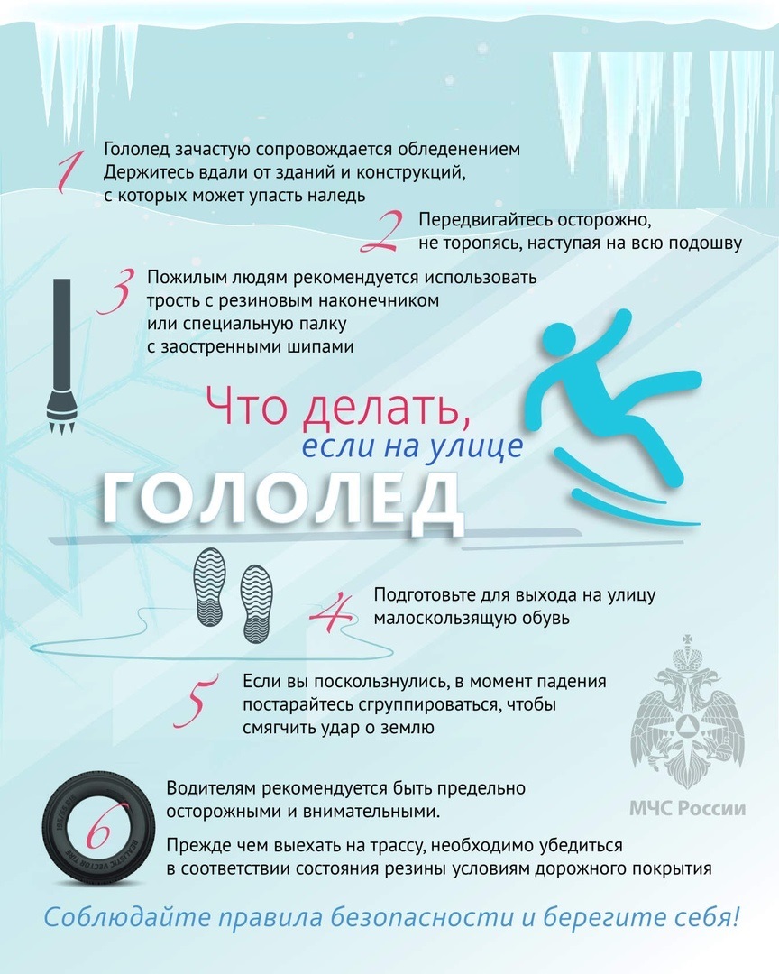 УВАЖАЕМЫЕ ЖИТЕЛИ САЯНСКОГО РАЙОНА! В соответствии с информацией ФГБУ «Среднесибирское управление по гидрометеорологии и мониторингу окружающей среды от 25 декабря 2023г. 26 декабря в центральных и южных районах Красноярского края на дорогах гололедица. Рекомендации пешеходам Прежде чем выйти на улицу, следует правильно подобрать обувь. Зимняя или демисезонная обувь должна иметь не скользящую подошву. Наиболее не скользким считается полеуретан и термополеуретан. Безопасность при гололеде на дороге зависит от того насколько правильно и хладнокровно ВЫ будете реагировать. Существуют следующие рекомендации для автомобилистов: Необходимо соблюдать скоростной режим, обязательно соблюдайте дистанцию. Запрещается осуществлять резкое торможение и опускать педаль газа. Под запрет попадает и выключение сцепления. Эти действия приведут лишь к тому, что Ваш автомобиль вынесет с дороги. Не выпускайте руль из рук, но и не крутите его резко в разные стороны. При преодолении подъемов немного увеличьте скорость, чтобы в самом процессе не приходилось переключать передачу. Обязательно соблюдайте дистанцию. Не прибегайте к резким маневрам во время обгона. В аварийной ситуации выручить может использование ручного тормоза. Правильное поведение автомобилистов лежит в основе безопасного движения. Телефон экстренных служб 112.
