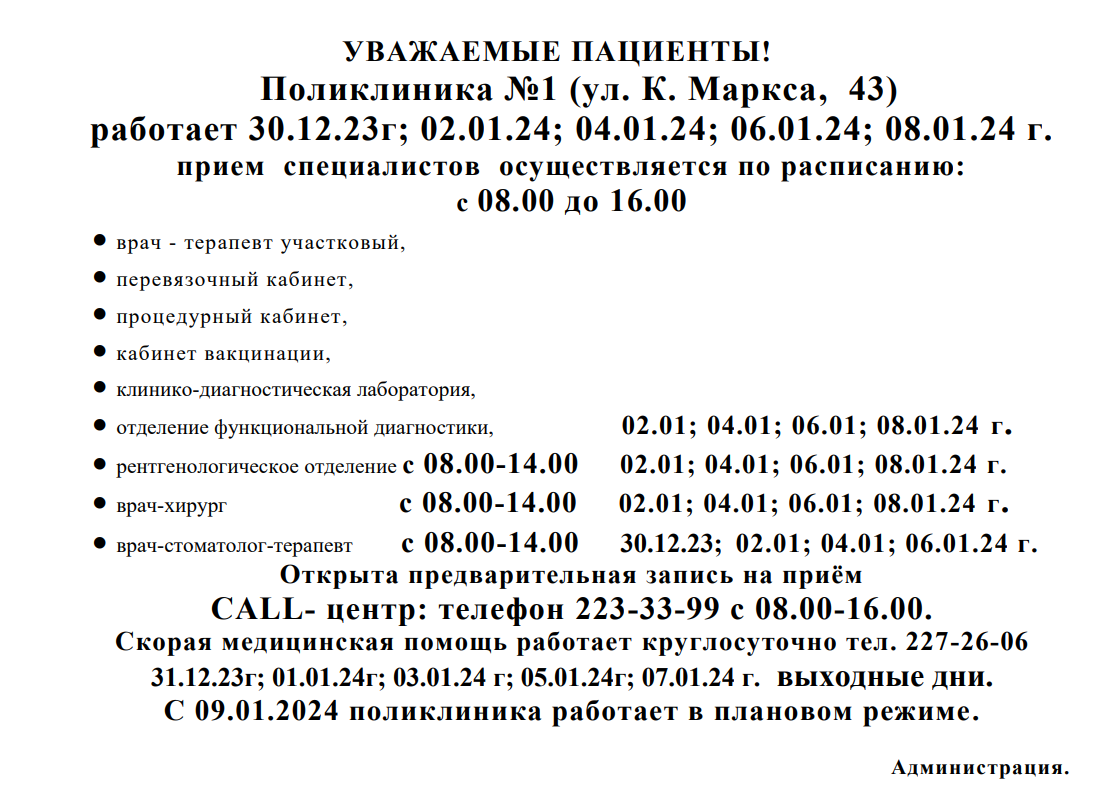 Поликлиника №1 (ул. К. Маркса, 43) работает 30.12.23; 02.01.24; 04.01.24; 06.01.24; 08.01.24 г.
