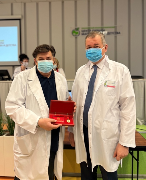Главный врач Красноярского краевого Клинический Центр охраны материнства и детства Вадим Янин вручил юбилейный почетный знак Красноярского края «200 лет образования Енисейской губернии» Андрею Панфилову – врачу ультразвуковой диагностики отделения ультразвуковой и функциональной диагностики №1, с общим трудовым стажем в 40 лет, из которых 32 года Андрей Яковлевич трудится во благо пациентов нашего центра.