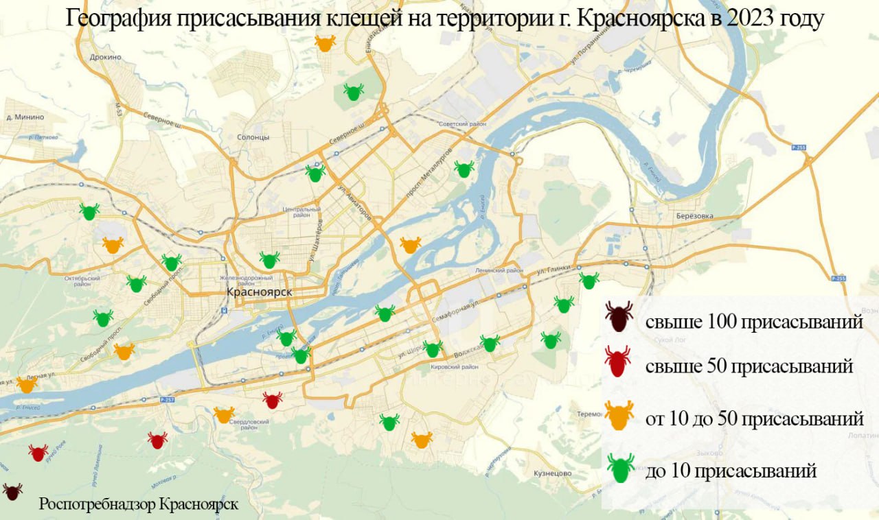 В Роспотребнадзоре составили карту активности клещей на территории Красноярска. Специалисты отметили, что чаще всего встречи с клещами происходили при выходе в лес, выездах на природу и на дачу. Также случаи присасывания фиксировались в населенных пунктах, в том числе Красноярске.