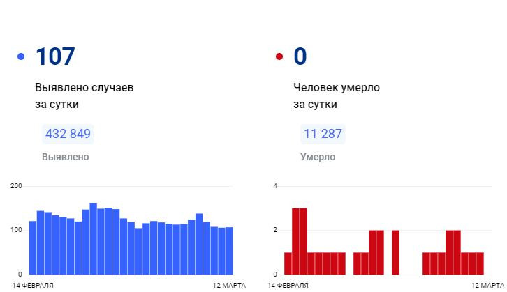 За всё время зафиксировано 432 849 подтверждённых диагнозов (+107 за сутки) 420 438 человек выздоровели (+110 за сутки) 11 287 погибших (+0 за сутки) 7 человек госпитализировано за суткиПоследние новости