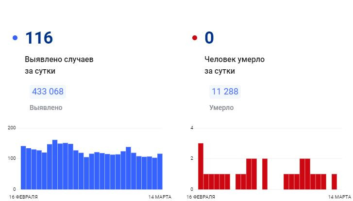 За всё время зафиксировано 433 068 подтверждённых диагнозов (+116 за сутки) 420 548 человек выздоровели (+68 за сутки) 11 288 погибших (+0 за сутки) 39 человек госпитализировано за суткиПоследние новости