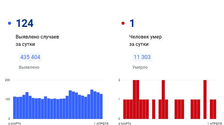 За всё время зафиксировано 435 404 подтверждённых диагноза (+124 за сутки) 422 645 человек выздоровели (+125 за сутки) 11 303 погибших (+1 за сутки) 18 человек госпитализировано за суткиПоследние новости