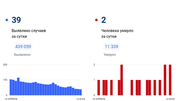 За всё время зафиксировано 439 059 подтверждённых диагнозов (+39 за сутки) 426 994 человека выздоровели (+40 за сутки) 11 339 погибших (+2 за сутки) 16 человек госпитализировано за суткиПоследние новости