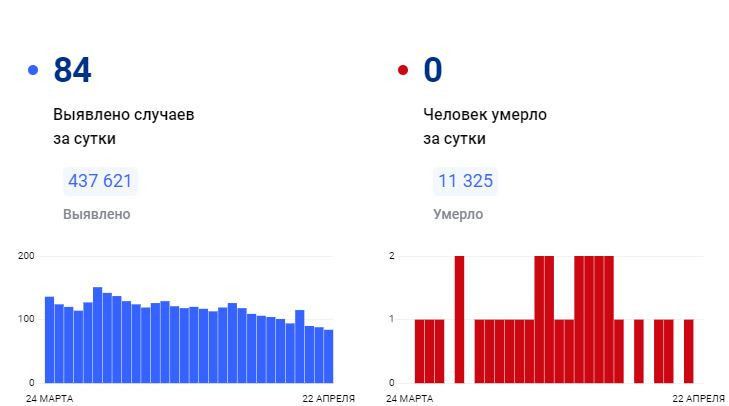 За всё время зафиксирован 437 621 подтверждённый диагноз (+84 за сутки) 425 082 человека выздоровели (+80 за сутки) 11 325 погибших (+0 за сутки) 25 человек госпитализировано за суткиПоследние новости