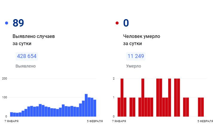 За всё время зафиксировано 428 654 подтверждённых диагноза (+89 за сутки) 416 504 человека выздоровели (+75 за сутки) 11 249 погибших (+0 за сутки) 19 человек госпитализировано за суткиПоследние новости