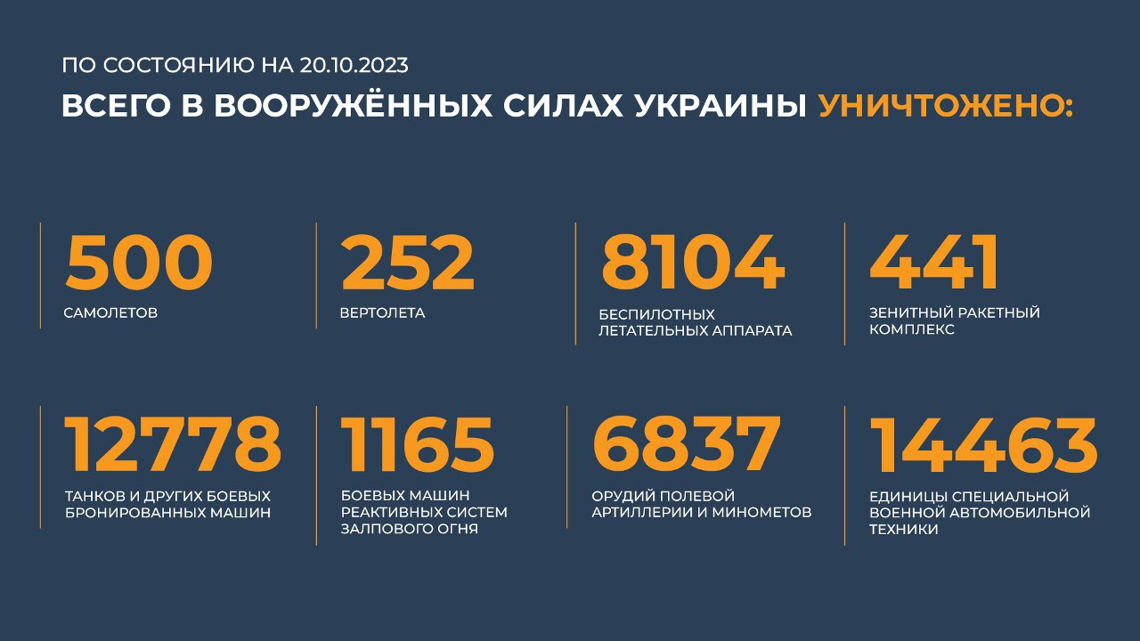 Всего с начала проведения специальной военной операции уничтожено: 500 самолётов, 252 вертолёта, 8 104 беспилотных летательных аппарата, 441 зенитный ракетный комплекс, 12 778 танков и других боевых бронированных машин, 1 165 боевых машин реактивных систем залпового огня, 6 837 орудий полевой артиллерии и миномётов, а также 14 463 единицы специальной военной автомобильной техники.