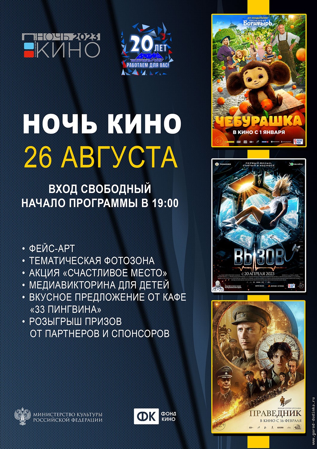 В преддверии Дня российского кино, 26 августа, в кинодосуговом центре «Арктика» пройдет ежегодная Всероссийская акция «Ночь кино-2023». В программе — три отечественные картины 2023 года: «Чебурашка» (6+), «Вызов» (12+) и «Праведник» (12+). Организаторы обращают внимание зрителей на то, что показы состоятся в вечернее и ночное время, поэтому несовершеннолетние дети без сопровождения взрослых к просмотру допускаться не будут.