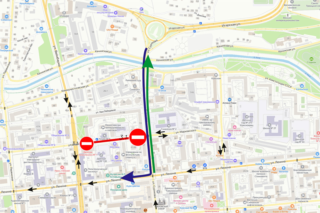ездить предлагается по Сурикова и Ленина.