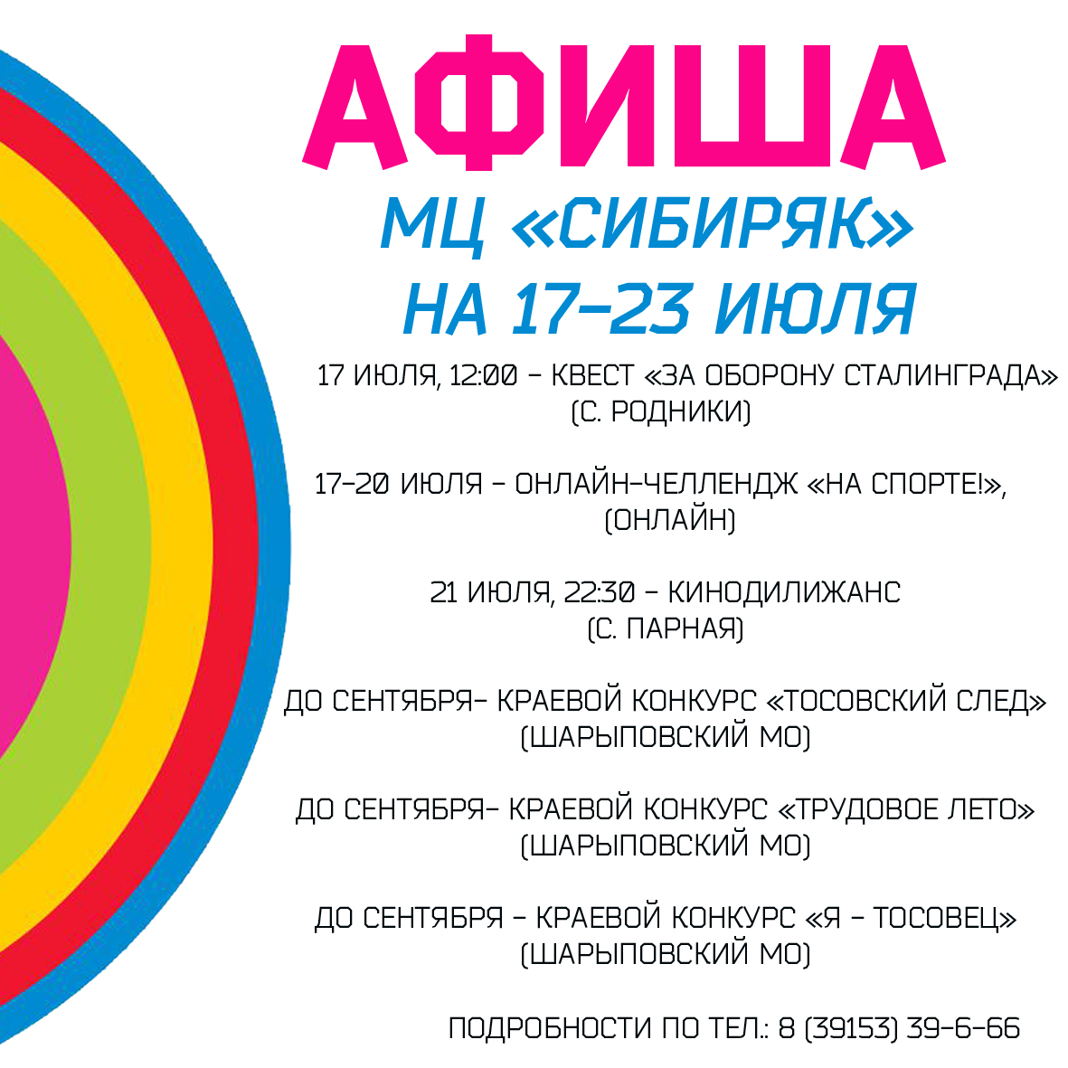 На территории Шарыповского муниципального в рамках реализации молодежной политики функционирует молодежный центр «Сибиряк», который еженедельно предлагает молодежи округа принять участие в социально-значимых, творческих, образовательных и развлекательных мероприятиях. Публикуем афишу молодежного центра на следующую неделю.