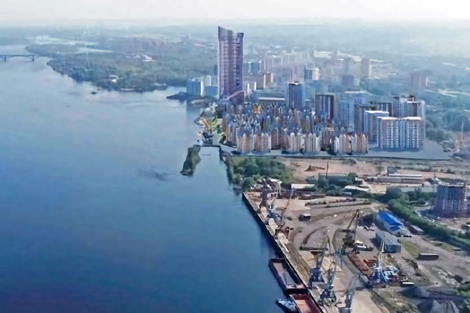 Проектировщики рисовали здесь самую высокую за Уралом жилую башню в 61 этаж, а также набережную с мостом-рестораном, часовней на воде, причалом и смотровой площадкой.