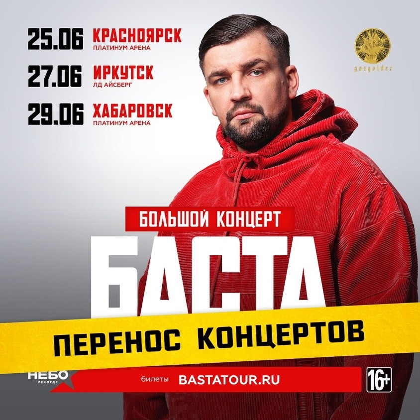 Также отменены выступления Басты в Иркутске (27 июня) и Хабаровске (29 июня).