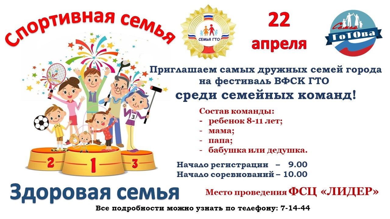 22 апреля в ФСЦ «Лидер» состоится первый этап фестиваля Всероссийского физкультурно-спортивного комплекса «Готов к труду и обороне» (ГТО) среди семейных команд.
