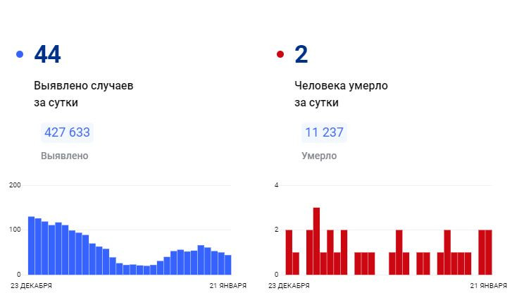 За всё время зафиксировано 427 633 подтверждённых диагноза (+44 за сутки) 415 661 человек выздоровел (+82 за сутки) 11 237 погибших (+2 за сутки) 11 человек госпитализировано за суткиПоследние новости