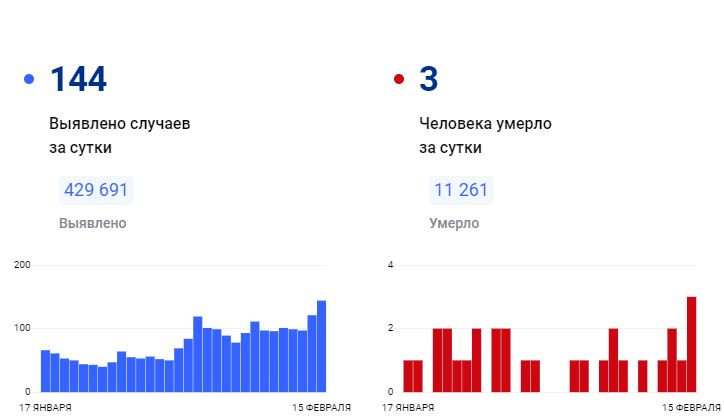 За всё время зафиксирован 429 691 подтверждённый диагноз (+144 за сутки) 417 277 человек выздоровели (+106 за сутки) 11 261 погибший (+3 за сутки) 46 человек госпитализировано за суткиПоследние новости